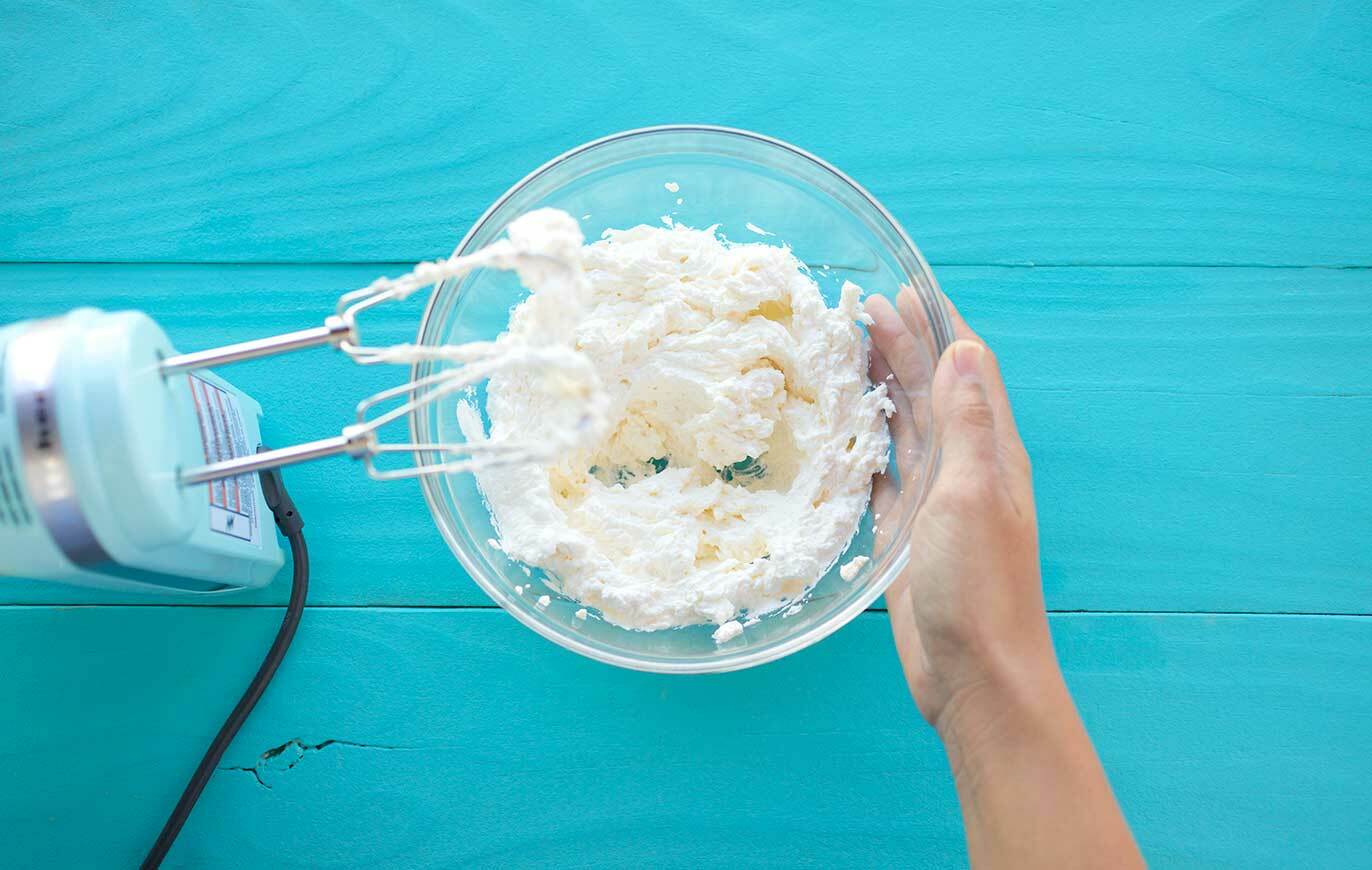 STEP2.準備大碗,將奶油乳酪、糖和香草精攪打至順滑. 加入蛋黃並低速攪拌直到混合.