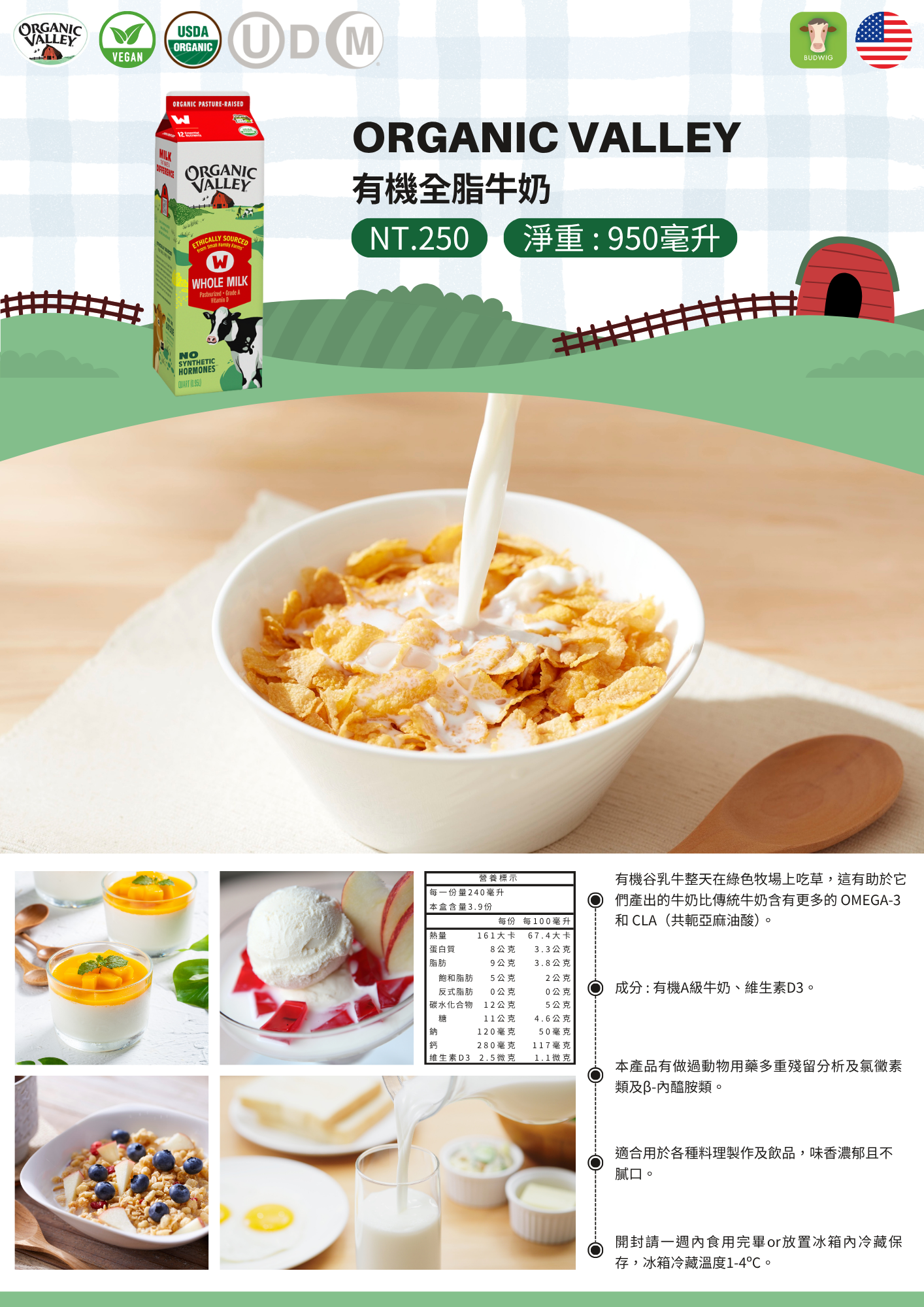Organic Valley 奶牛每天都在綠色牧場放牧,這有助於他們生產比傳統牛奶含有更多 omega-3 和 CLA(共軛亞油酸)的牛奶。我們生產的牛奶始終不含抗生素、合成激素、有毒殺蟲劑或 轉基因生物。