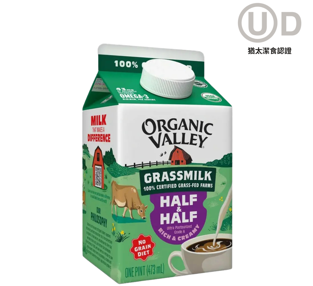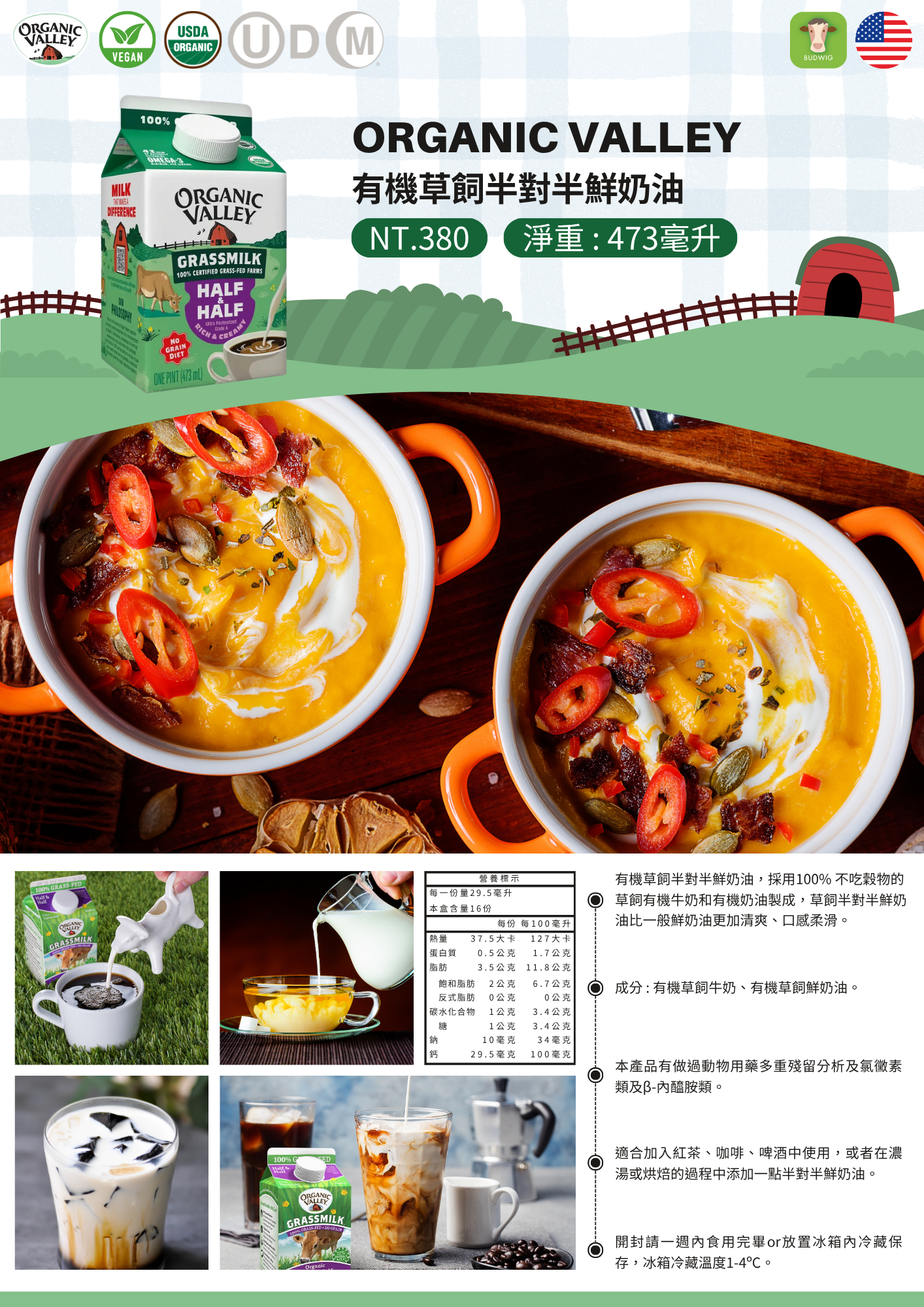 Organic Valley有機草飼半對半鮮奶油,採用我們 100% 不吃穀物的草飼有機牛奶和有機奶油製成,草飼半對半鮮奶油比一般鮮奶油更加清爽,口感柔滑。