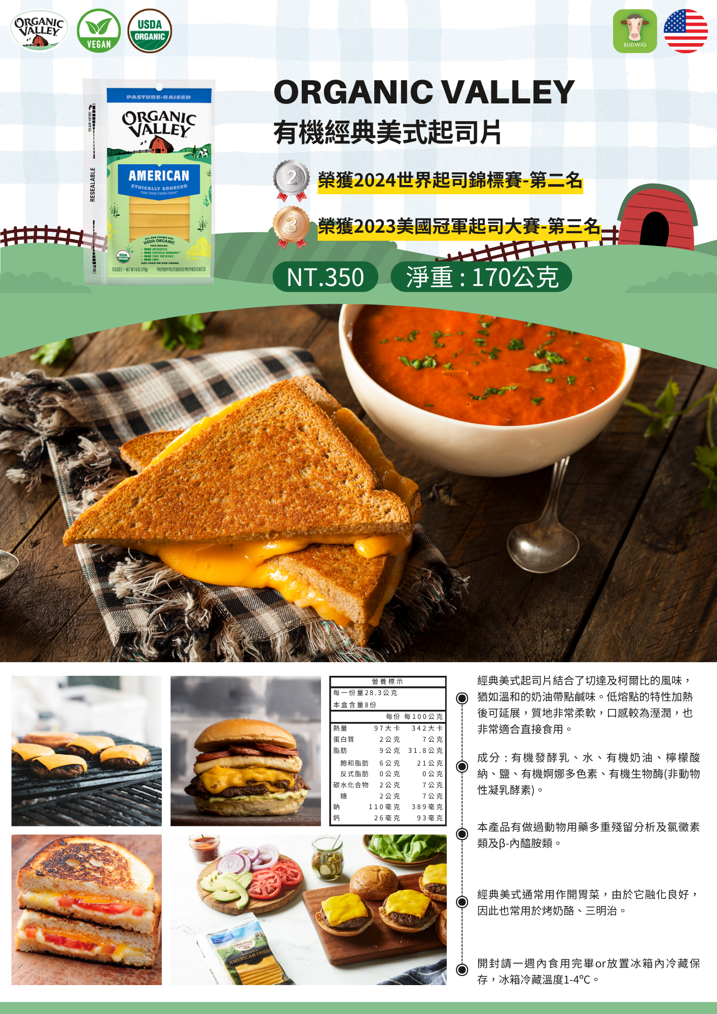 1經典美式起司片結合了切達及柯爾比的風味,猶如溫和的奶油帶點鹹味.低熔點的特性加熱後可延展,質地非常柔軟,口感較為溼潤,也非常適合直接食用.