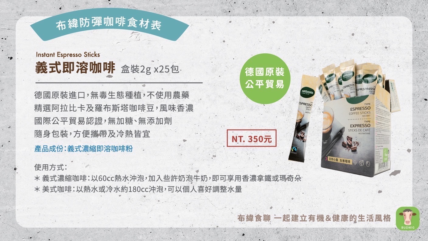Naturata 出品高規格即溶咖啡,通過國際公平貿易認證。本產品是混合來自烏干達,巴布亞新幾內亞,秘魯和洪都拉斯的合作社所精選的有機阿拉比卡及羅布斯塔咖啡豆,風味香濃,不苦澀!